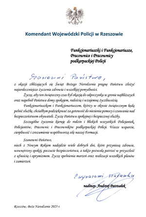 Komendant Wojewódzki Policji w Rzeszowie nadinsp. Andrzej Patrzałek, w imieniu własnym oraz kierownictwa podkarpackiej Policji, z okazji Świąt Bożego Narodzenia złożył życzenia wszystkim pracownikom i funkcjonariuszom Policji, a także policyjnym emerytom i rencistom.