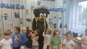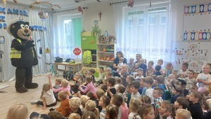 Przedszkolaki chętnie przywitały się i pozowały do zdjęć z maskotką podkarpackiej Policji – Misiem POPO.