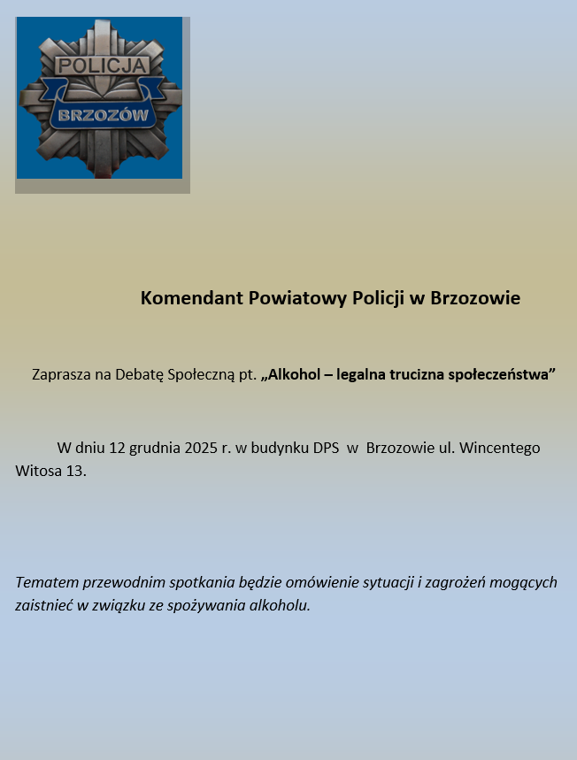 Policjanci Komendy Powiatowej Policji w Brzozowie zapraszają na debatę społeczną „Alkohol – legalna trucizna społeczeństwa”. Debata odbędzie się 12 grudnia 2025 r. o godz. 10:00 w Domu Pomocy Społecznej w Brzozowie przy ul. W. Witosa 13. Serdecznie zapraszamy.